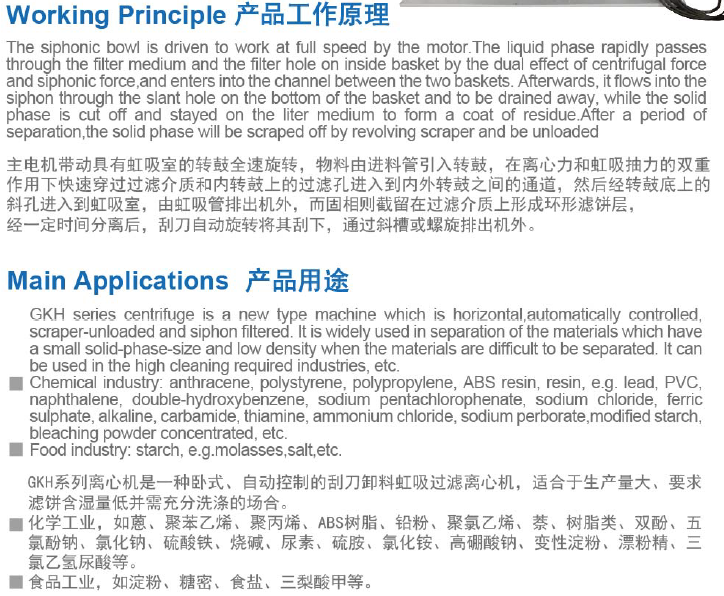 主電機(jī)帶動(dòng)具有虹吸室的轉(zhuǎn)鼓全速旋轉(zhuǎn),物料有進(jìn)料管引入轉(zhuǎn)鼓,在離心力和虹吸抽力的雙重作用下快速穿過(guò)過(guò)濾介質(zhì)和內(nèi)轉(zhuǎn)鼓上的慮孔進(jìn)入到內(nèi)外轉(zhuǎn)鼓之間的通道,然后經(jīng)轉(zhuǎn)鼓底上的斜孔進(jìn)入到虹吸室,由虹吸管排除機(jī)外,而固相則截留在過(guò)濾介質(zhì)上形成環(huán)形濾餅層,經(jīng)一段時(shí)間分離后,刮刀自動(dòng)旋轉(zhuǎn)將其刮下,通過(guò)斜槽或螺旋排出機(jī)外。