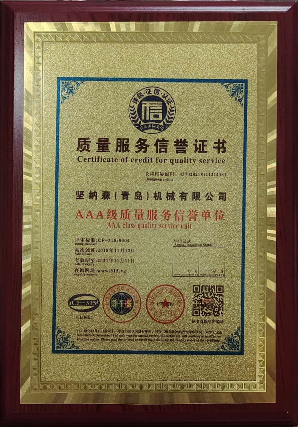 質(zhì)量服務(wù)信譽證書